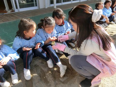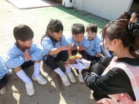 「焼けたよ!」と声が掛かると大急ぎで子どもたちは外へ駆け出していき、焼き立てのお芋を見ようと必死! 焼きたての焼き芋を小さく手に乗せ、「アツアツや!」「美味しすぎる! おかわり!」と大喜びでした。あっという間に焼き芋を完食! ホクホクの焼き芋を食べて、心も温かくなった幸せな時間でした。