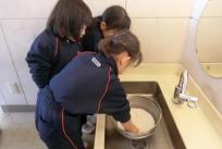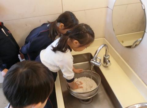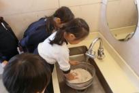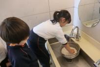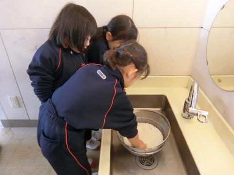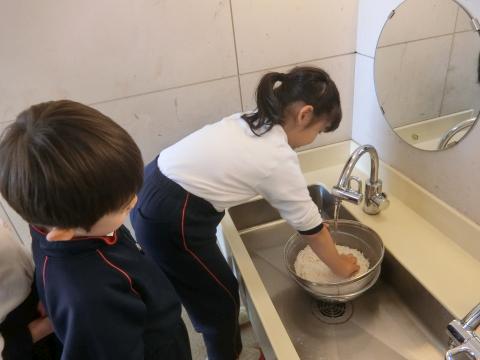 明日のお餅つきのために年長組はもち米を研ぎました。田植えや稲刈りを経験し、お米が出来るまでは長い時間がかかることも知った子どもたちは、一粒もこぼさないように一人ひとり丁寧に研いでいましたね。きっと美味しいお餅になることでしょう。