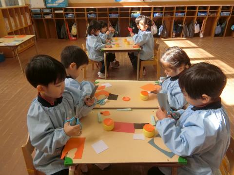 ぺんぎんのお父さんやお母さんが海で魚を捕る場面を思い浮かべながら、魚やオキアミ(エビ)を作り、お道具の海に泳がせてあげました。「お魚はこっち向きに泳いでるよ!」「オキアミはこの辺にいてる!」と、可愛らしいつぶやきも聞かれ、一匹ずつに思いをもっている姿が微笑ましかったです。