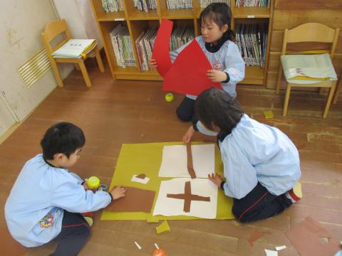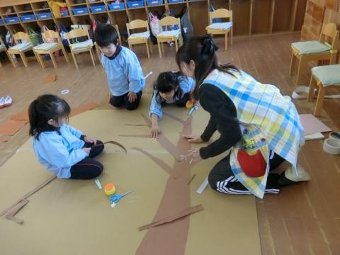 “雪が沢山積もった木”“お家”“あまい蜜の花”など、道具作りでも子どもたちは、制作する道具のイメージがしっかりとあり、それぞれに想像力を働かせて形にしていました。