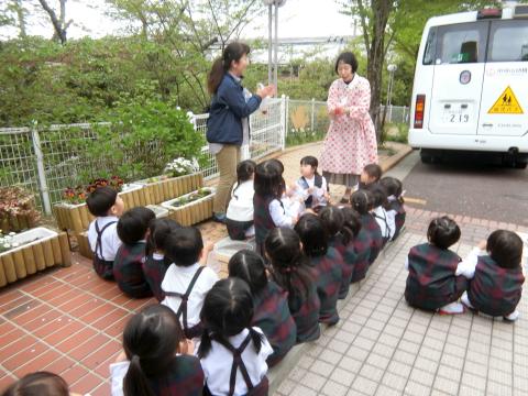 保護者会が行われているあいだ、年少のお友だちは、2歳児の先生と遊びました。