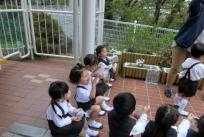 その後、外に出て花壇の落ちている赤と黄色のチューリップの花びらを拾ってビニールの袋に入れると、先生がお水を入れてくれました。それを一生懸命揉んでいくと・・・ あら不思議!お水の色が赤や黄色に変わっていきます。「赤いジュースになった!」「リンゴジュースや!」「私のは黄色いジュース!」と大喜びでした。