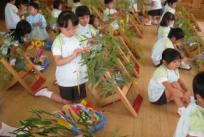 日本の伝承行事のひとつ七夕を幼稚園でも楽しみました。全員で集まって、園長先生から「七夕」という言葉の由来についてなど話を聞き、織姫、彦星のお話のペープサートを鑑賞しました。その後は、お部屋に戻り、この日までに少しずつ作ってきた笹飾りを一人一本ずつの笹に結んでいきます。五色紙、輪つなぎ、短冊、すいか…。短冊にはそれぞれの願い事が書いてあります。どうぞみんなの願いがかないますように…☆