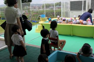 年長組のプール遊びをちょっぴりうらやましそうに見学するお友だちや保育室の前にあるザリガニに、園児と一緒にえさをあげてくれるお友だちもいました。後半は、ペンギンパクパクを作って、自分で作ったお魚を捕まえて遊びました。また、シャボン玉遊びでは、年少組の園児も自然に加わって、キャッキャッと歓声を上げて楽しんでくれていました。あっという間に予定の時間が終了しました。ご参加いただいた皆さん、ありがとうございました。またぜひ幼稚園に遊びに来てくださいね。23日(月)、24日(火)も同様に参観・体験を行います。よろしければ、お越しください。電話で受け付けております。