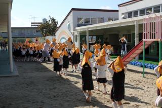 全園児と2歳児クラスも含めて一緒に避難訓練を行いました。今回は震度4以上の地震が起きたと想定しての訓練です。