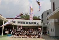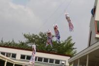 先日参観日に年長組がフィンガーペインティングで制作したこいのぼりが完成し、大空を初泳ぎしました。年長組の子どもたちはもちろんのこと、年中さんも年少さんも気持ちよく泳ぐ鯉のぼりに大歓声を上げていました。青空によく映えて、楽しい5月が迎えられそうです!