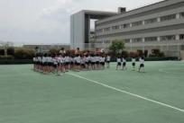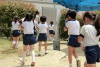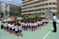 火災を想定した避難訓練を行いました。警報音と「給食室から火災が発生しました…。」のアナウンスが流れると、各クラスの子どもたちは静かに、日頃から担任の先生に教えられている注意を守りながら、園庭の奥に集合しました。全員の安全が確認できた後、避難用通路を通って、学園の鳩の広場まで移動します。階段があり、鼻と口をタオルで押さえながらの行動は年少組さんにとってはなかなか難しいですが、私語もなく全員短い時間で非難できました。園長先生からも「鼻と口をしっかりタオルで抑えて、煙を吸い込むことがないように注意して非難しましょう」などという話を聞き、、無事に訓練は終了しました。今回も緊張感を持った良い訓練ができましたので、非常時であっても落ち着いて行動できるようにこれからも備えていきたいと思います。