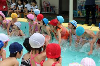 幼稚園でもプール開きをしました。ちょっと冷たい水ですが、初日ということで、水位をぐっと下げて浅い水にしていましたので、子ども達は不安もなく元気に遊ぶことができました。これから毎日天気の良い日にはプール遊びをします。年長組は来週から温水プールでの水泳指導も始めます。夏の遊びを存分に楽しみましょう。