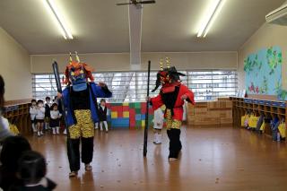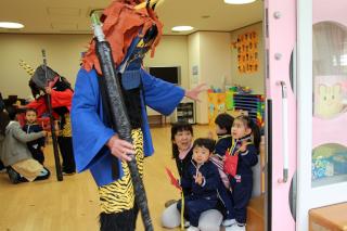 鬼は外、福は内! 今日は節分で、幼稚園でも豆まきをしました。赤鬼、青鬼がお部屋に入ってくると、みんないっせいに豆をまきました。自分が逃げるのに必死で、なかなか追い払えません。!「良い子にするか?」と鬼から言われて、「良い子にします!!」と約束すると、鬼も退散して、ゆっくり生駒の山へと帰っていきました。もちろん、2歳児クラスりす組さんも鬼を追い払いました。これで新しい年も無病息災でみんな過せそうです。ようやく春がやって来ますね。