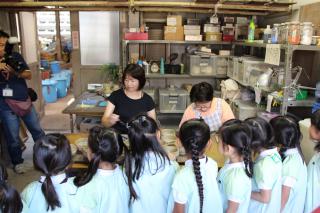 年長組は赤膚焼窯元大塩昭山先生にご指導頂き、お茶碗作りをしました。最初に先生のたくさんの作品を見せていただき、実際に作業されている様子を見学しました。いろいろな道具があって、目を丸くする子ども達です。大きな釜ものぞいてみました。そしていよいよ自分達も挑戦させていただくことになりました。先生の説明を一生懸命聞いていましたが、本当にやってみるとなかなか難しく、みんな最後まで必死に取り組んでいました。先生方が最後の手直しをしてくださると、みんな自分の作品にうっとりです。好きな形に整えて完成させました。これから釜で焼いていただいて、どんな作品になるのかとても楽しみですね!