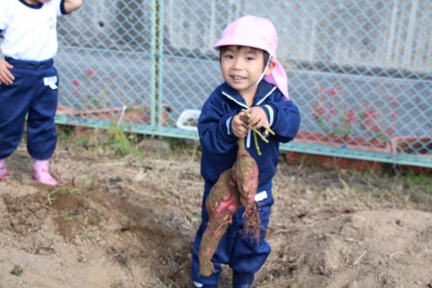 降園時には、「お母さん、見て!」と重いお芋入ったの袋を一生懸命抱えて、誇らしげに門を出て行く姿は、とても微笑ましいものでした。きっと今晩の夕食には美味しいお芋料理が並ぶことでしょうね!