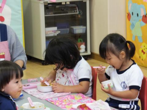 2歳児クラスも月に一度、その月のお誕生日会をして給食を食べています。いつもはお弁当なので、この日はちょっぴり特別です。みんなで一緒に同じものを食べるのも嬉しい時間です。今日も「おかわりください」の声がたくさん聞かれました。