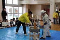 年の瀬迫る中、今日は朝から、全員そろっておもちつきです。まずは園長先生がお正月のお餅についてのお話をしてくださいました。そして園長先生や育友会の会長様、現業のおじさんたちがお餅をつき始め、いよいよ年長・年少・年中の順番に、リズム室でおもちつきが始まりました。