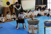そして、つきたての温かいお餅は、園児達それぞれのクラスに戻ってから振舞われ、きな粉にまぶしたり、しょう油に浸けたり、どの食べ方が1番美味しいか食べ比べしたり…と思い思いの食べ方で楽しみました。自分達で一生懸命ついて出来上がったお餅です。おいしくないはずがありません。案の定、「ハフハフハフ、おいしいね」「やっぱりつきたてのおもちはおいしい!」と各教室から満足げな感想がたくさん聞かれました。お手伝いいただいた役・委員の皆様、ありがとうございました。