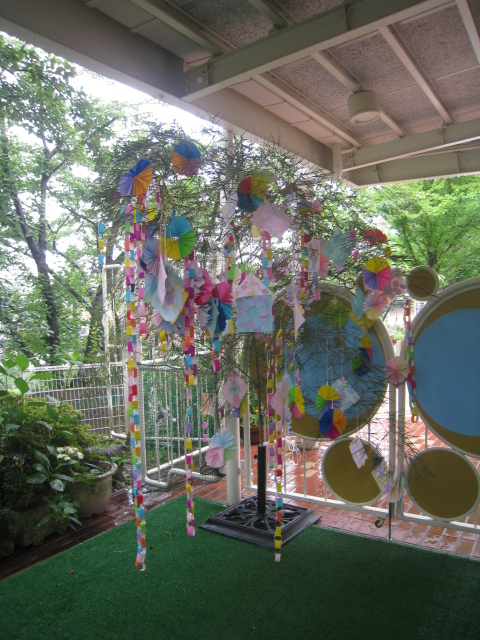 7月7日 七夕の日です。頭に星をつけて素敵な星になった子ども達がリズム室に大集合です。みんなで七夕のおはなしを聞いて、歌を歌いました。部屋に戻ってからは、この日のために、頑張って作った笹飾りを、「どこにつけようかな?」とワクワクしながら笹につけていました。完成すると「できた!」と笑顔一杯です!みんなの願い事がかないますように。