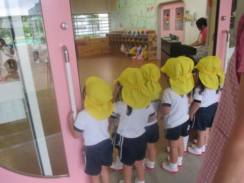 気温が低くてプールに入れなかった日、りす組は幼稚園の探検に出かけました。お歌を聞かせてもらったり、お部屋でピアノに合わせてウサギになったりヘビになったり・・・・。枝豆を植えるところを見せてもらったり、大きなカメも見ました。幼稚園って楽しいな!おにいさん、おねえさん、また、一緒に遊んでね。