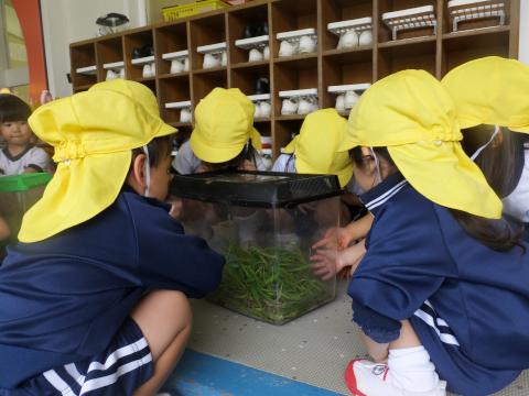 2歳児クラスのみんなは、汽車になって、「しゅっぽ!しゅっぽ!」と言いながら雨を見に行きました。途中で年少組のバッタやカマキリを見たあと、リズム室で体操クラブの準備体操を一緒にさせてもらい、お兄さんお姉さんの迫力にびっくりしました。