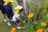 お部屋で運動会の練習をした後、園庭でぼちぼち落ち始めたどんぐりを拾いました。「よーい、どん!」をして走ったり、花壇のコスモスをのぞいたりもしましたね。