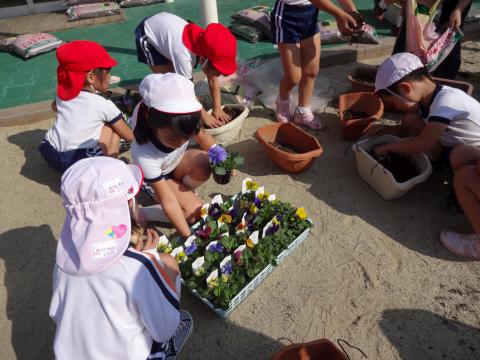 来年入園してくる小さなお友達のためにチューリップの球根をスロープの花壇に植えました。パンジーや桜草・ジュリアンなどの苗をプランターに植える時は、“花の並べ方” や “色の順番” を相談しながら自分たちで考えていて、さすが年長さんでした!!