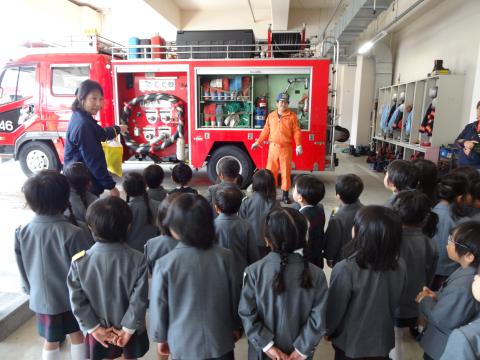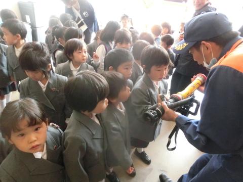 年少組は、幼稚園バスに乗って消防署へ行ってきました。「消防車は、火事になったら火を消すんだよ」「ウ~カンカンカンって鳴らして走るんだよ」と朝から楽しみにしていた子ども達!! ポンプ車から勢いよく水が出てくるのを見て驚き、救急車やはしご車に乗せてもらって大喜びの1日でした。