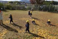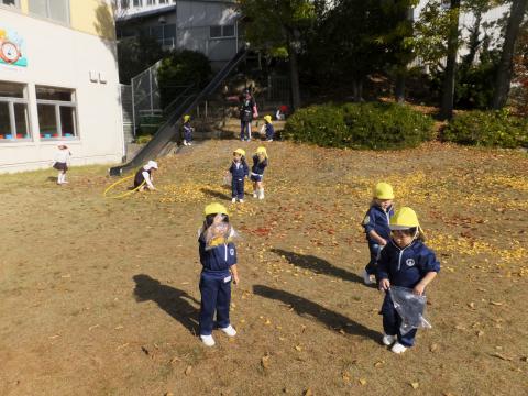 園庭の木の葉もきれいに色づいています。今日は、久しぶりにお池の金魚を見にいきました。「金魚さーん!」 「ごはんですよ!」とみんなでごはんをあげると、金魚も嬉しそうに大きな口でパクパク。その後、赤い葉っぱや黄色い葉っぱを見つけて、たくさん拾いました。たまたま出会った年長さんも手伝ってくれて、みんな大喜び!! 「ママにみせてあげる」 というお友だちもいましたよ。