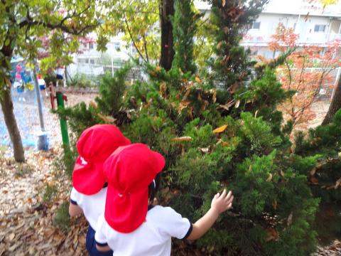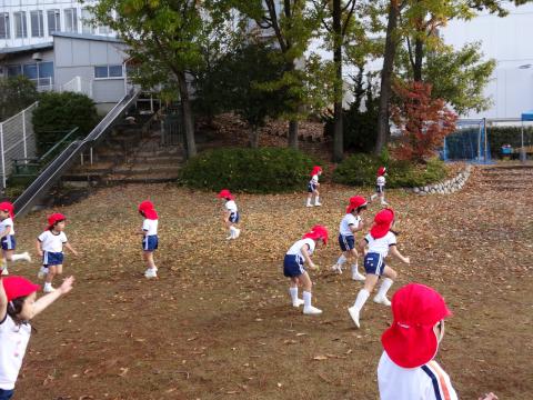 「わぁー、葉っぱだらけだ~!!」 と園庭をかける子どもたち。葉っぱがいっぱいの斜面も登っていきます。「こんな葉っぱ見つけた!」 「木の上に落ちてる!!」 「葉っぱの上を歩くと、ふわふわだよ。」 と葉っぱがすごくたくさん落ちていたのが嬉しかったようです。 お部屋に戻ってからは、拾ったお気に入りの葉っぱを自分たちで飛ばして遊び、「ひらひら落ちた。」 「くるくる落ちたくるりん葉っぱだよ」 と喜んでいました。