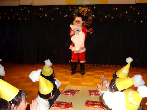 今日はクリスマス会。この日のために作った帽子をかぶり、昨日、飾り付けをしたリズム室に全学年が集まりました。先生たちの「クリスマスのお話」のブラックシアターを見たり、 マリンバの演奏を聴いたり、ゲームをしたりと楽しく過ごしていると、突然鈴の音が聞こえてきて・・・!? 突然のサンタクロース登場に子どもたちも大喜び!! サンタさんにプレゼントをもらって、幼稚園のみんなでクリスマスのお弁を当食べた嬉しい一日になりました。