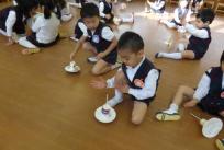 「かわいいコマできたよ!」「コマつくるの楽しかったよ!」と嬉しそうな子どもたち。今日はコマの制作です。紙皿、紙コップにキラキラ紙で模様をつけ、マジックで好きなお絵描きをして、すてきなコマが出来上がりました。「コマいっぱい回ったよ!」とコマ回しも楽しんでいましたね。