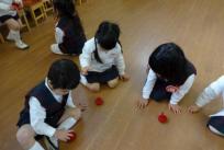 コマ回しを楽しんだ年少さん。みんなが回したのは、芯が長い木製の赤いコマです。長い芯のところを手で持って回したのですが、はじめは、上手く回せなくて何度も挑戦! 「見て。」「こんなに回るよ。」とだんだん嬉しそうな声が・・・。 みんなで回しっこ競争もしたよ!!