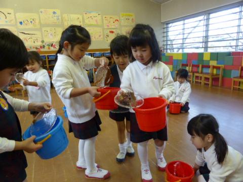 「氷を作ろう!」 とバケツに水を入れて、園庭に置いていた年少さん。いつできるかな?と毎朝、楽しみにバケツをのぞいていたのですが、とうとう凍りました。「すごーい、寒い。」 「だから、絶対氷できてると思う。」 と言いながら登園してきた子どもたちは、バケツの中を見て、大喜び。 「氷できてる!」 「こんな丸いのできた!」 と、とても嬉しそうでした。