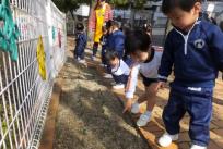 ぽかぽかいい天気の日。2歳児クラスのうさぎ組のお友だちは、幼稚園の通園路の花壇にチューリップを見に行きました。まだまだお花は咲いていないけれど、大きな葉っぱが開き始めていました。 「チューリップの赤ちゃんだよ!」 「かわいいね!」 「ここにもあるよ!」 とみんな嬉しそう。他にも春が見つかるかな? 別の花壇に黄色の大きな水仙を見つけました。 「もうすぐ春ですよ!」