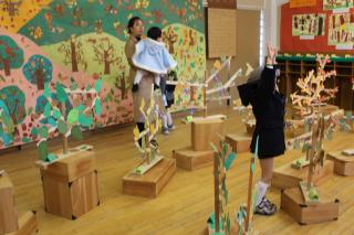 この日はどのクラスも力を尽くして頑張った、絵画、紙制作、版画、陶芸、木工制作などの作品が並びました。
