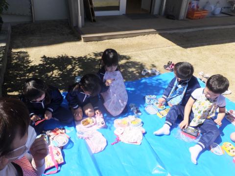 今日は春季保育の1日目です。ぽかぽかいい天気なので、お弁当はお庭にシートを敷いて、みんなで輪になって食べました。お外で食べるとおいしいね。