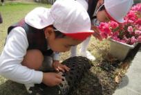 お天気のいい日は、園庭に出て春を見つけています。緑の草の中に映える黄色いタンポポは、子どもたちの大好きな花です。年長のお友だちは、小さな可愛い花を見つけて、「何ていう花かな?」 と、首から提げた小さな図鑑で調べることを喜んでいます。だんご虫を見つけるのを楽しんでいるお友だちもいます。今度は、誰に出会えるかな~ ♪♪