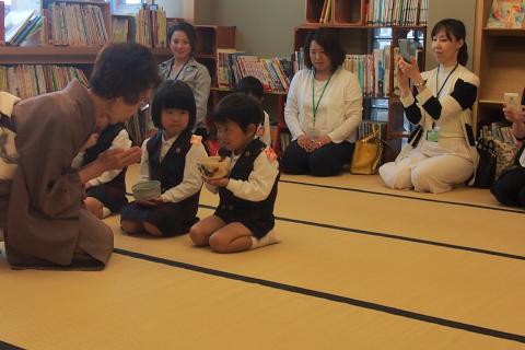 『茶道 をやってみたい!』 と初めて参加する子、昨年に続いてもう1年『お茶が好き!』と入ってみた子達が集まったチャレンジプログラム。初日は保護者の参観でした。裏千家流尾崎先生のご指導のもと、楽しい雰囲気の中、お軸とお花の拝見、お扇子を置いてご挨拶、お茶菓子と先生の点てて下さったお茶を戴きました。尾崎先生にこの1年、季節のお花の名前を教えて頂いたり、お軸を読んで意味を教えて頂いたりしながら、季節のお茶菓子とお茶を皆でおいしく戴く 『茶道の時間』 を楽しく過ごしましょう。