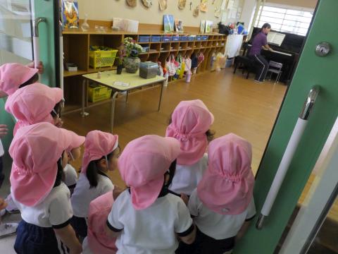 今日は、朝から曇り空。帽子をかぶってお外に行こうと靴を履き替えたら、ぽつぽつと雨が!残念!では、幼稚園探検に出かけましょう。年中さんのところでザリガニを観察した後、年長さんのお部屋を訪問しました。一緒にリズムをしたり、お歌を歌いましたよ。ちょっぴりどきどきしたけど、「また、おいでね。」と言ってもらってみんな嬉しそう。リズム室で体操も見学しましたよ。