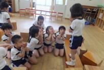 “つばめになって飛んで飛んで遊ぼう♪”「つばめになって」という歌の歌詞にもあるように、子ども達はツバメになって遊ぶのが大好きです。「早く大きくなって欲しいから、子ども達にエサをしっかりあげなくっちゃ!」「お父さんお母さんみたいに立派なツバメになりたい!」と、親ツバメや子ツバメの気持ちになりきって遊んでいる姿は、とても楽しそうです。親ツバメにエサをもらう可愛い子ツバメになったり、気持ち良さそうに青い空を飛ぶ親ツバメに憧れを持って飛んだり、お部屋でも毎日みんなで想像を膨らませながらツバメで遊んでいます♪