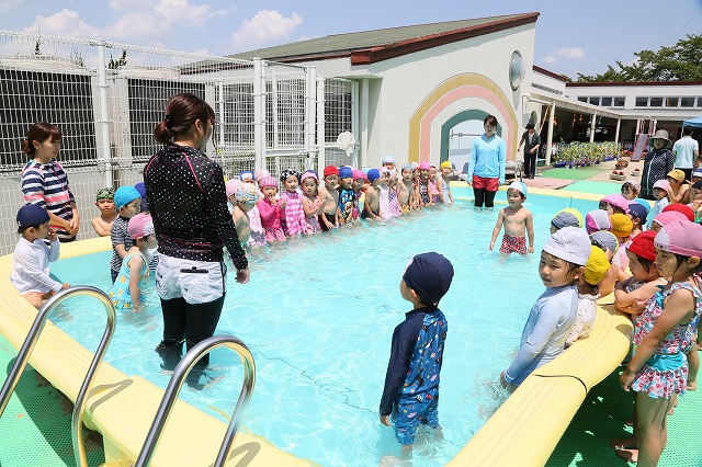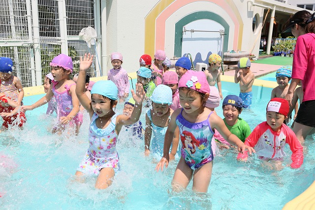 27日(月)からプールが始まりました。初日は天気も良く、「はやくプールに入りたいなぁー」「見て。こんなプールバックだよ」 「ピンクのかわいい水着持ってきたよ」 と、朝から嬉しそうに登園してきた子ども達。プールでは、ピョンピョン跳んだり、走ったり、ワニさんになったり、魚になったり、水鉄砲をして喜んでいましたね。 初めてのプールだった年少さんは、「あー、楽しかった!! 明日も入ろうね♪」 と、笑顔でした。