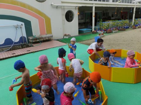 今日は朝からいいお天気!「プール、持って来たよ!」とプールバックを下げて子どもたちは大はりきり。水着に着替えて体操をしたら、いよいよプールです。「ばちゃばちゃしないよ。」といっていたお友だちも水鉄砲で水をとばしておおはしゃぎ。シャワーを浴びてお昼ご飯を食べたらみんな眠たくなってお昼寝をしましたよ。