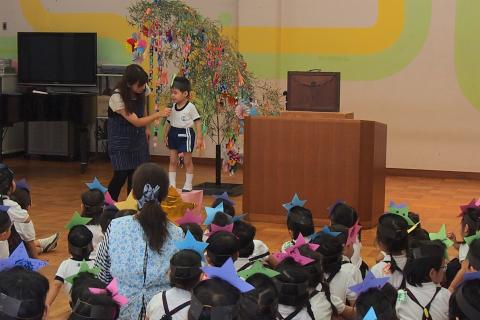 今日は、帝塚山幼稚園の七夕祭りでた。星飾りを頭につけて、全園児がリズム室に集まり、先生による紙芝居 『なぜ七夕にささかざりをするの?』 を見たり、各学年ごとに願い事を聞いたりしました。最後は、前日みんなが飾り付けをした大きな笹に園長先生が、<てづかやまっこが みんなげんきで なかよくあそべますように> という願いを込めた短冊を飾り、みんなで 「たなばた」 の歌を歌いました。2歳児クラスのお友だちも一緒に楽しみましたよ。お部屋に戻ってからは、一人ひとりの笹に飾り付けです。年少組はお母さん、年中組は年長さんが手伝ってくれましたね。みんなの願い事が叶いますように。