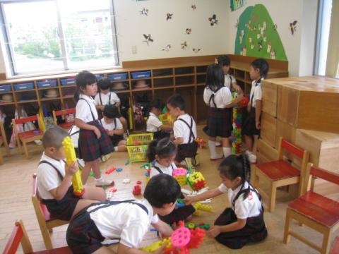 年中組と年長組で一緒に食べた給食はとても美味しかったですね。年中組のお友だちは、年長組のお部屋に食べに行ったことやお兄さんお姉さんの隣の席に座って食べたことが嬉しくて、年長組になったような気分を味わっていました。給食後は、一緒にブロッックで遊び、ブロックを楽器にみたてて『ミッキーマウスマーチ』を演奏していて楽しそうでしたね。