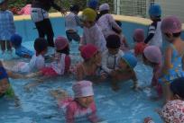 プールでは、大きい組さんがワニさんになって小さい組さんを背中に乗せてくれました。乗せてもらったお友だちは、嬉しそう! フープのトンネルもくぐりましたね。その後、帝塚山大学の “まつぼっくり” に出かけて行き、おもちゃでたくさん遊びました。そして、今日もお母さんが作ってくれたお弁当を美味しそうにほおばっていたみんなです。