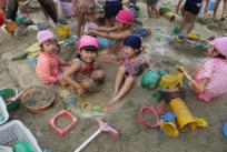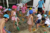 今日の夏季保育では、思いっきりどろんこ遊びを楽しんだ子ども達です。砂場に好きなだけ水を運んで川を作り、魚になって泳いだり、泥を足につけたりして喜んでいました。その後は、みんなで砂場のおもちゃを洗ってくれましたね。そして、水鉄砲で飛ばし合いをして遊びましたよ。たくさん遊んだ後のお弁当は、とても美味しかったですね。