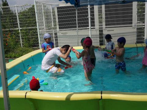 今日の夏季保育では、プール遊びをした後、スノードームを作りました。見本を見て、「わぁー、きれい!」 と、声を上げていた子ども達。蓋についている発泡スチロールに魚をさし、容器にマジックで海のお絵描きをします。 「キラキラのかわいいのにしよう。」 「どんなお魚か描こうかな~」 「ワカメも描こう。」 と、楽しみながら作っていました。すてきなスノードームが出来上がりましたね。