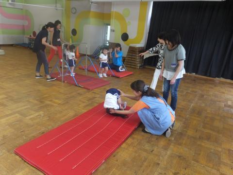 2学期が始まりました!今日は2学期始めての親子体操です。元気に朝の会をしたら、お家の方と一緒にお楽しみの体操です。準備運動を「イッチニ!!」として大好きなサーキットをしました。“跳び箱ジャンプ”や“鉄棒でつばめ”、マットで“でんぐり返り”などをしました。みんな腕の力も強くなり、鉄棒に長くぶら下がれたり、ジャンプも高くなり、でんげり返りも上手に出来るようになってびっくりしました。運動会も張り切っていこう!!