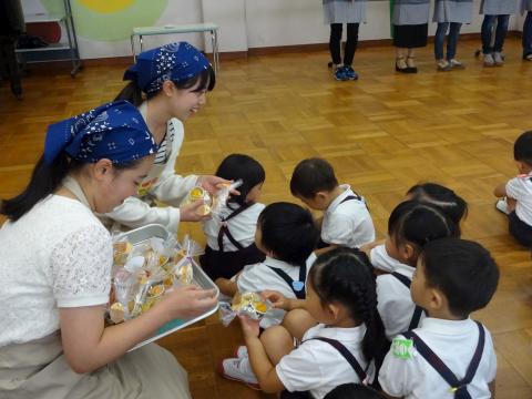 16日(金) は、『食育 お誕生日イベント』として帝塚山大学現代生活学部食物学科の学生が考えた特別メニューの給食でした。奈良でたくさん生産されているそうめんを使ったにゅうめんや、お祝いのちらし寿司、ほうれん草のおひたし、豆とじゃこのかりかり揚げなど、どれも美味しく頂きました。「おかわりしよーっと!」「美味しいね♪」と子どもたちも喜んでいました。持って帰ったデザートの「スウィートポテト」「かぼちゃのカップケーキ」は、大学生が作ったもので、材料の“さつまいも”“カボチャ”がどういうふうに育つか、食べると体の何にいいかについてのお話をリズム室に集まってみんなで聞きましたね。