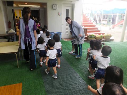 16日(金)、2歳児クラスはみんなで幼稚園の人形劇に参加するので、りす組うさぎ組の合同登園です。いつもよりたくさんの友だちと朝の会をして、いよいよリズム室に人形劇を観にいきます。お兄さん、お姉さんたちに混じって後ろのイスに座ると、はじまり!はじまり!かわいいくまとかわいい女の子が出てくる「3匹のくま」という人形劇を観ました。みんなにこにこ、わくわくで楽しみましたよ!最後はお人形にご挨拶をしてお部屋に帰りました。