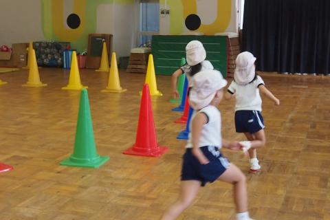 体操の先生とかけっこや 「 フープで1・2・3 GO ! 」 の競技の練習をしています。フープを使っての競技は、三個つながったフープの中に一人ずつ入って三人揃って走っていかなくてはなりません。これがなかなか難しいのです。でも、少しずつ息が合うようになってきました。運動会の日もその調子で頑張りましょうね。この競技クラス対抗です。どちらが勝つかお楽しみに!
