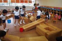 先週、どんぐり拾いをした日から毎日どんぐりと遊んでいる年少・年中さんたちです。登園してきたら、「 おはよう 」 と、どんぐりに挨拶しているお友だちもいます。最初は、どんなどんぐりを拾ったかな~と、並べて喜んでいましたが、そのうちに 「 これ、シャカシャカどんぐり。ほら、シャカシャカって音がするよ。」 「りんごどんぐりだよ。りんごみたいな形してるでしょ。」 「見て、このどんぐり立つよ。」 と、お気に入りのどんぐりも見つけました。お友だちとお気に入りのどんぐりを転がしたり、回したりして遊ぶ姿も見られます。自分たちが好きなすべり台は、どんぐりたちも好きかな~と、積み木で滑り台を作って転がしたり、積み木でどんぐりのお部屋を作って並べたり、いろいろな遊びを楽しんでいます。