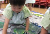 制作展の作品の一部に、フィンガーペィンティングでお絵描きをしました。ズボンも脱いでスモックを着て、さあ始めるよ!お部屋に大きなシートを敷いたら準備完了。好きな色を両手につけて画用紙いっぱいに描きました。「赤がいい!」「見て見て!」「うわあ!」みんな大興奮で絵の具の感触を楽しみました。